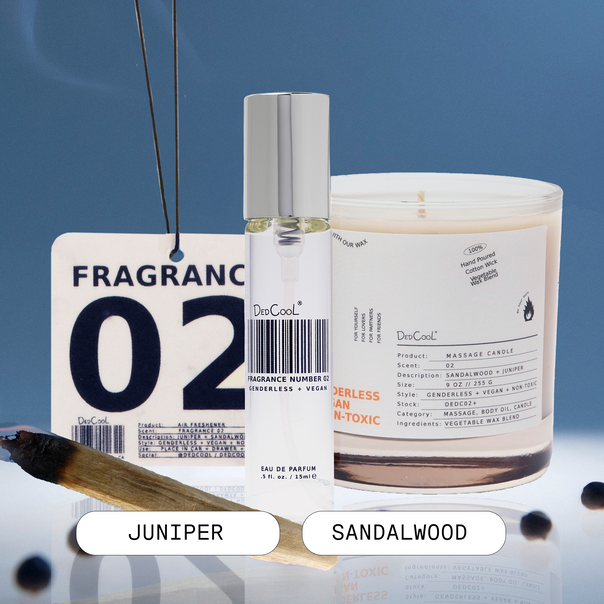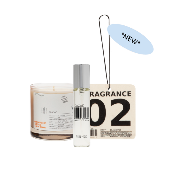 Drench your life in FRAGRANCE 02. Enjoy our troublemaker scent at home, or on the go. This trio includes a Massage Candle, Travel Spray and Air Freshener, bundled for 20% off.Â