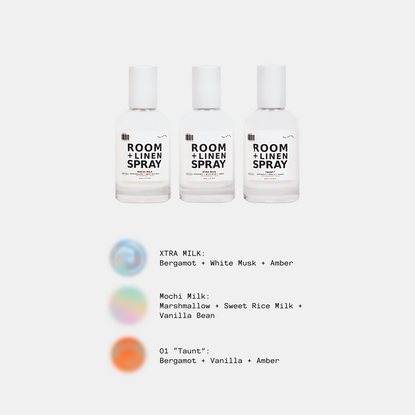 A trio of mini personal fragrances for your personal spaces in 3 of our best-selling scents: XTRA MILK, MOCHI MILK and TAUNT. Made for clothing, sheets, or anywhere that needs freshening.