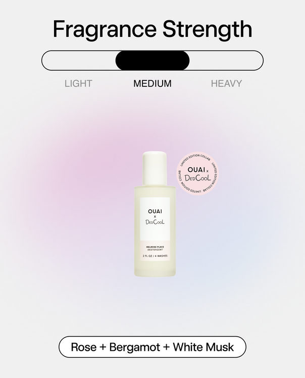 OUAI’s Internet-iconic Melrose Place scent swirls notes of rose, bergamot, + white musk, and combines perfectly with our tried + true Dedtergent formula. Because you deserve to stop and smell the roses more.